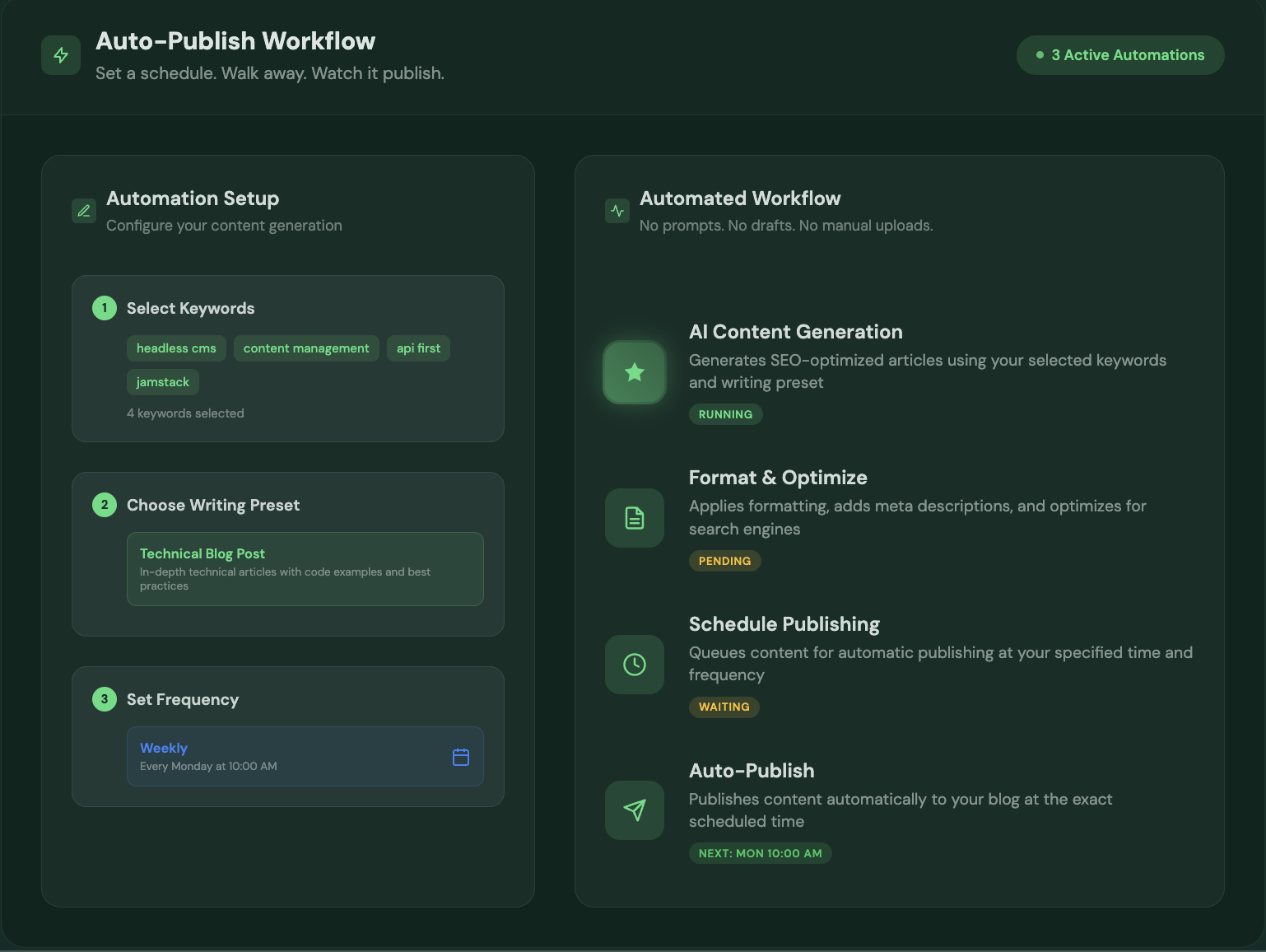 Set a schedule. Walk away. Watch it publish.