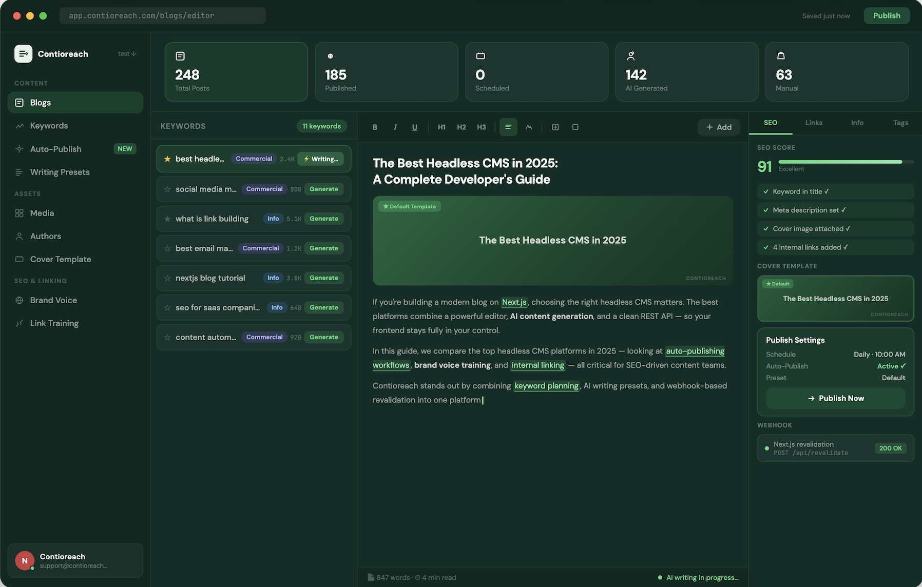 Build your blog with ContioReach—the best headless CMS for AI content generation, keyword planning, auto-scheduling, internal linking, enriched editor, SEO tools, cover templates, and multi-site management. One platform. Zero publishing.