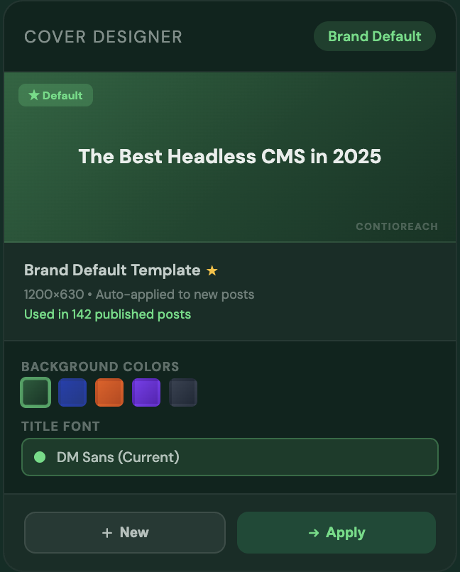 Design your cover template once — set your background color, title font, and layout. Every article Auto-Publish generates gets a 1200×630 cover image created automatically with the post title baked in. Applied to all new posts by default.