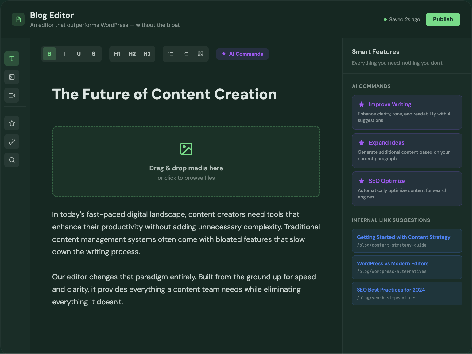 An editor that outperforms WordPress — without the bloat.