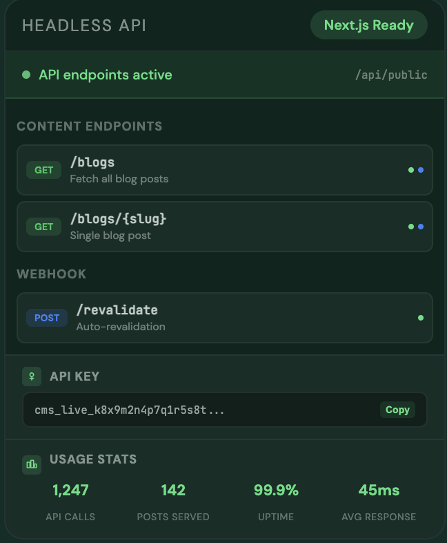ContioReach is fully headless. Connect any frontend with one API key and fetch posts, authors, tags, and categories as JSON. Auto-revalidation keeps your Next.js site fresh on every publish.