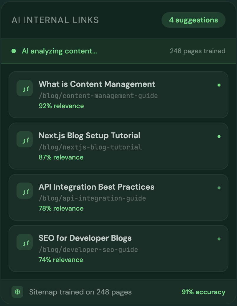 Train the AI on your sitemap and it crawls every page into memory. Every new article gets the most contextually relevant internal links suggested inline — with relevance scores so you know exactly why each link was recommended.