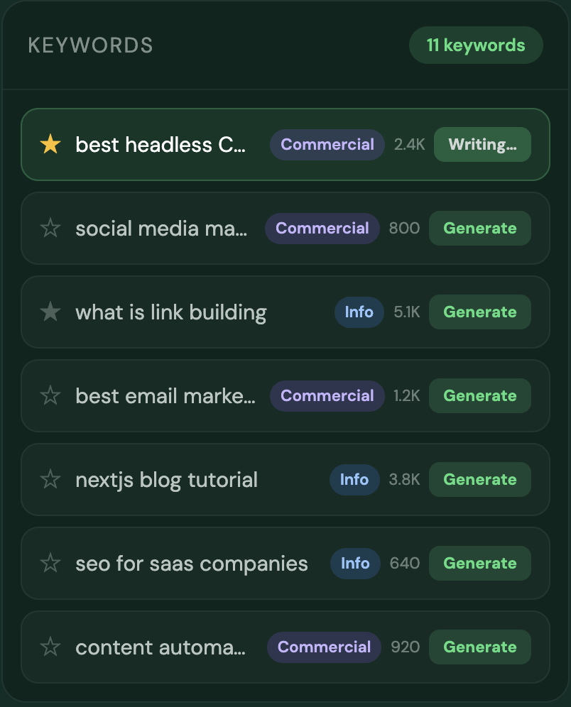 Add your target keywords once with search volume, CPC, and intent data. ContioReach picks them up one by one, writes a fully SEO-optimized article for each, and publishes automatically on your schedule — no brief, no prompt, no manual work.