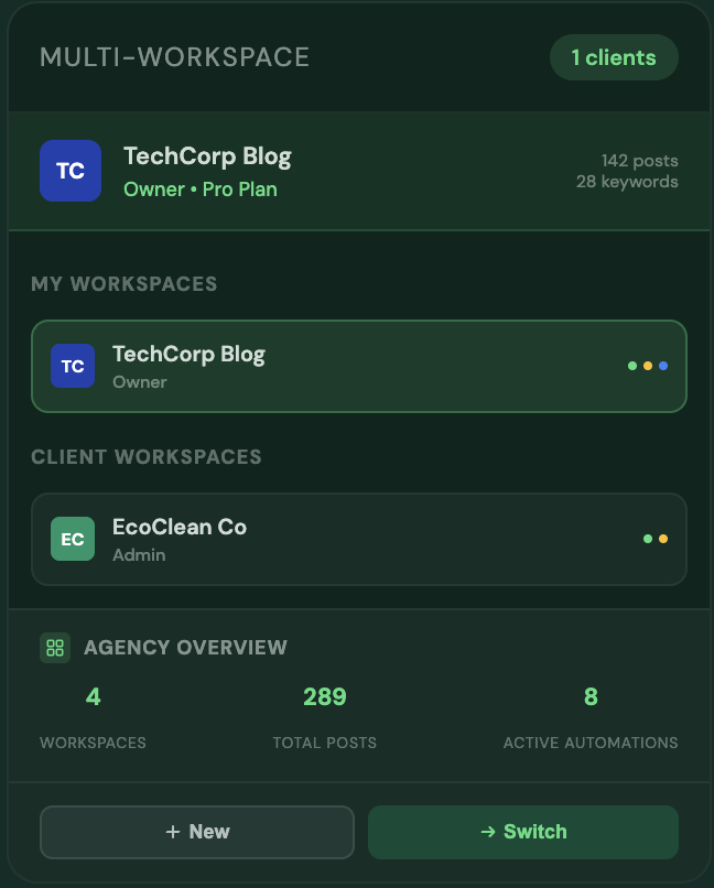 Manage multiple client workspaces from a single account — each with its own brand voice, keyword list, automations, team members, and API key. Switch between clients in one click. Built for agencies running content at scale.