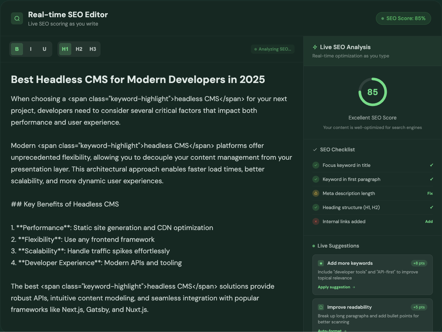 Real-time SEO scoring as you write — not after.