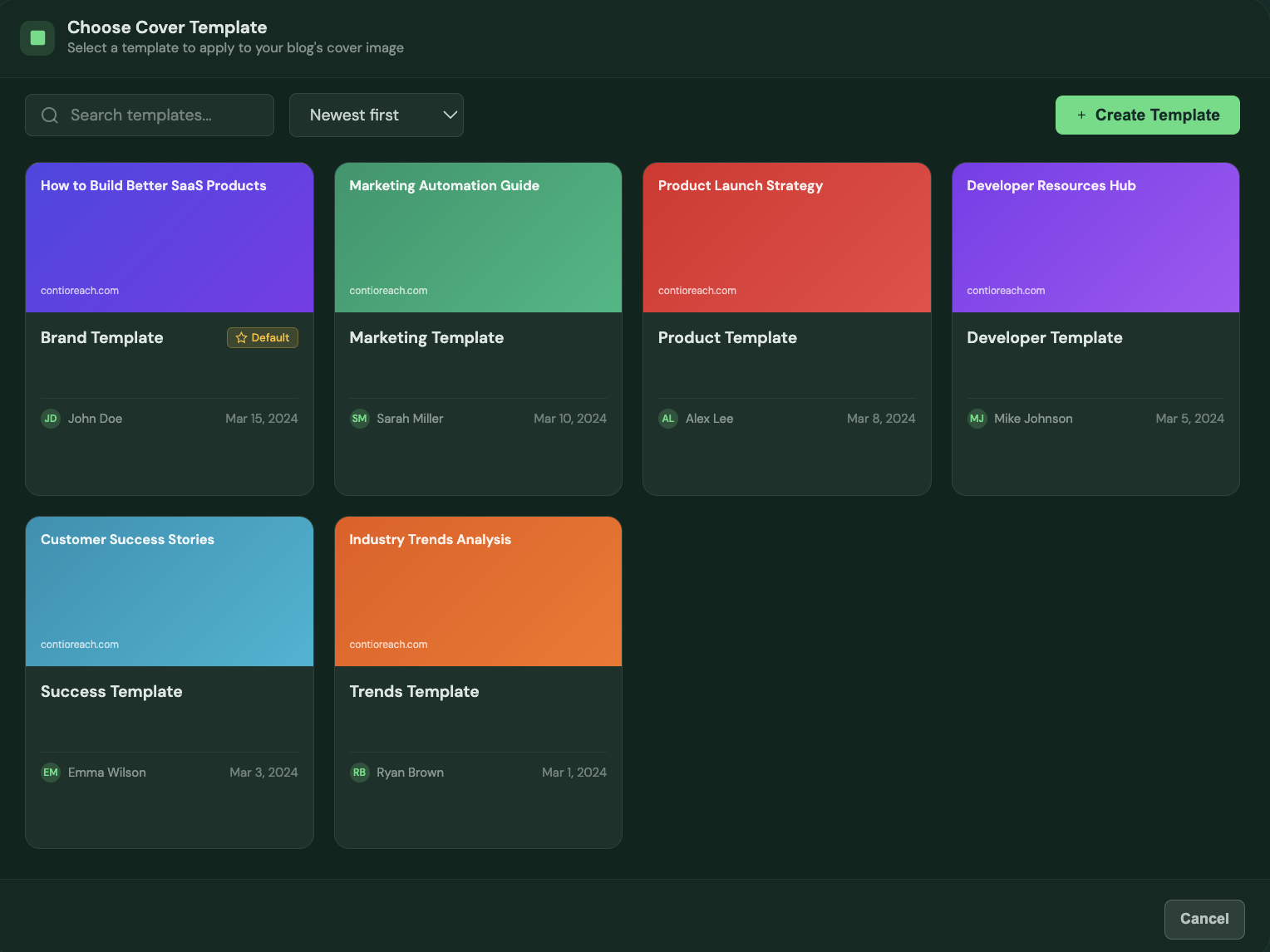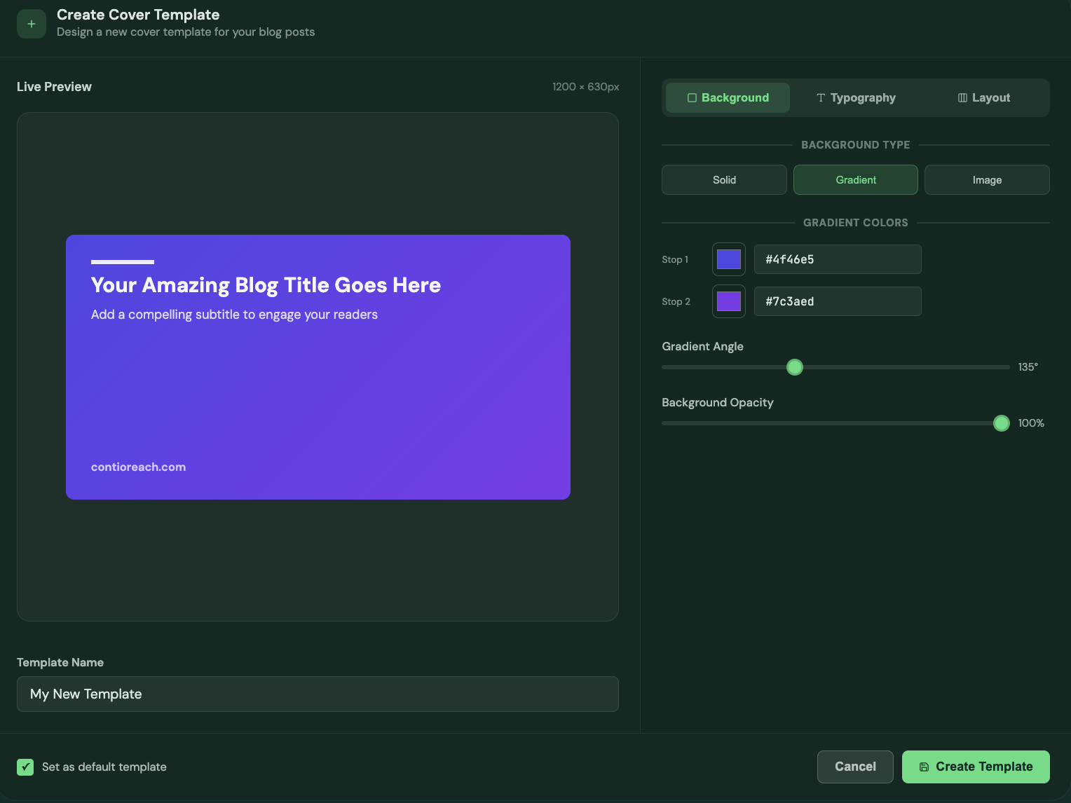 Select a template style, customize your brand elements, and let ContioReach automatically generate perfect cover images for every piece of content you publish.